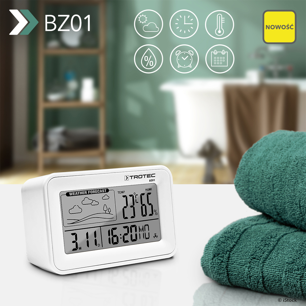 Jeżeli chcesz móc polegać na niezawodnym budzeniu każdego dnia, to zainteresuje Cię nasz nowy i wreszcie dostępny cyfrowy budzik BZ01 o eleganckim designie w kolorze matowej bieli. Obudzi Cię on punktualnie co do minuty, a jako urządzenie wielofunkcyjne oferuje również znacznie więcej. Wystarczy jedno spojrzenie na wyświetlacz LCD, by odczytać jednocześnie aktualną datę i dzień tygodnia, a także temperaturę i wilgotność powietrza w pomieszczeniu. Ponadto symbol wyświetlający prognozę pogody informuje, czy warto wcześnie wstać z łóżka.
