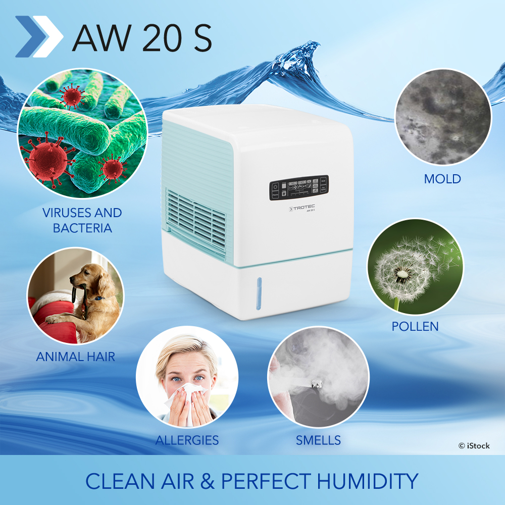 Firma Trotec dzięki nowym urządzeniom 3-w-1 AW 10 S i AW 20 S oferuje od teraz nawilżacz powietrza, oczyszczacz powietrza i neutralizator zapachów w jednym urządzeniu. O tej porze roku nawilżanie jest ważnym tematem, ponieważ zimne powietrze zawiera zdecydowanie mniej wilgoci — a rezultat doskonale znamy: wysuszone błony śluzowe zwiększają ryzyko przeziębienia i drażniącego kaszlu. Dzięki osobnej włączanej i wyłączanej funkcji nawilżania powietrza nowy AW 20 S może przez cały rok być używany do oczyszczania powietrza i neutralizowania zapachów.