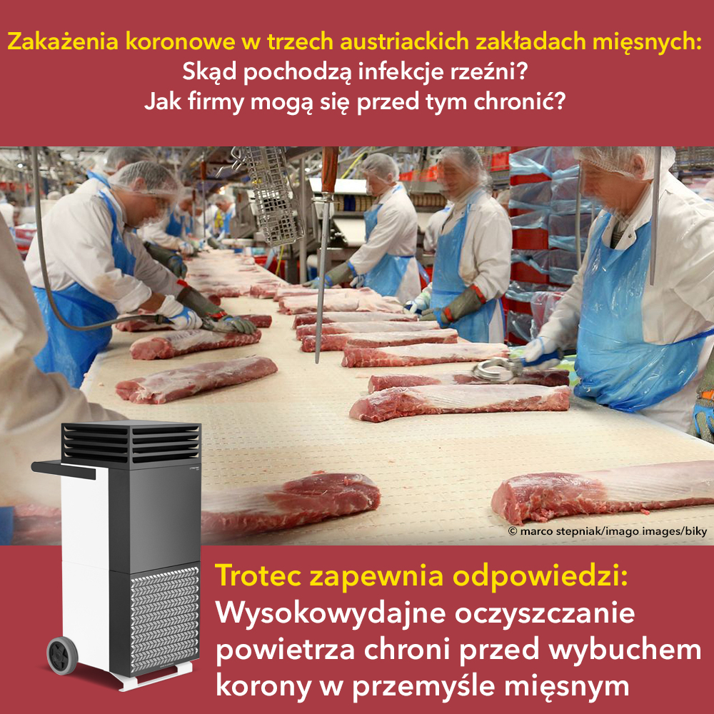 W jaki sposób zakłady mogą się przed nią chronić? Trotec zna odpowiedź na to pytanie: wysoce wydajne oczyszczanie powietrza pozwala uchronić się przed ogniskami koronawirusa w przemyśle mięsnym.