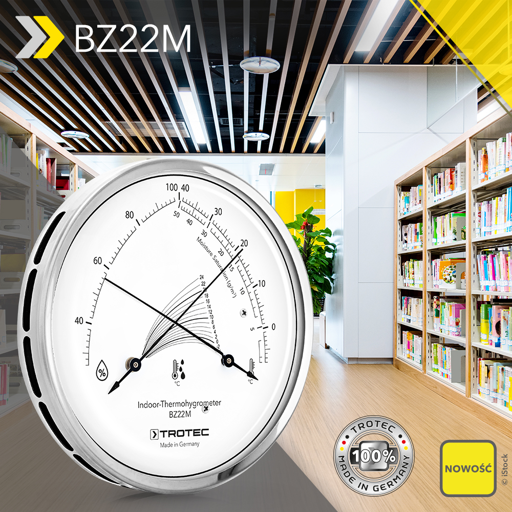 Wysokiej jakości termohigrometr analogowy BZ21M jest wreszcie dostępny. Łączy on w sobie precyzyjną analogową technikę pomiarową z klasyczną tarczą z dwiema wskazówkami, na której wskazywane są cztery najważniejsze parametry klimatyczne: temperatura w pomieszczeniu, wilgotność względna i bezwzględna oraz wilgotność nasycenia – to wszystkie istotne dla zdrowia wartości, które są widoczne już na pierwszy rzut oka. Z taką pomocą można stworzyć optymalny klimat zarówno w domowym salonie, jak i w biurze.
