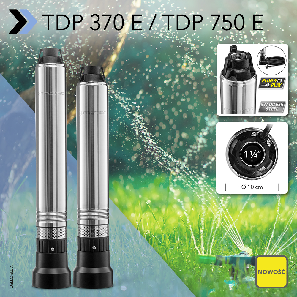 Nowe pompy do studni głębinowych TDP 370 E oraz TDP 750 E firmy Trotec są nareszcie dostępne. Jeszcze tylko krótki czas, a także w twoim ogrodzie mogłoby zabrzmieć hasło „Woda naprzód!” – również przy okazji bitew wodnych. A co najlepsze: I jak cała woda, którą za pomocą pomp do studni głębinowych można tłoczyć z własnej studni lub zbiorników wodnych, to beztroskie taplanie się kosztuje tyle co nic. A już całkiem serio, to oczywiście można wykorzystać darmową wodę użytkową także do nawadniania działek i ogródków Ale najpierw: „Woda naprzód!”