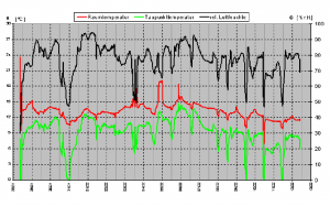 Pozwala to na rozwianie wątpliwości, czy przeciętna temperatura i wilgotność panujące w pomieszczeniu znajdują się w granicach zalecanej normy. Według literatury fachowej względna wilgotność powietrza w pomieszczeniu przy średniej temperaturze 20 °C powinna się mieścić w przedziale 30-65%. Na podstawie nakreślonego przez urządzenie wykresu można przewidzieć osiągnięcie momentu krytycznego – tzw. punktu rosy. Po jego przekroczeniu następuje skraplanie się pary, w rezultacie czego ściany zaczynają przemakać. Jeśli temperatura powierzchni muru leży poniżej wspomnianego punktu, powstają zacieki. Z czasem wilgoć zamienia się w czarne plamy.
