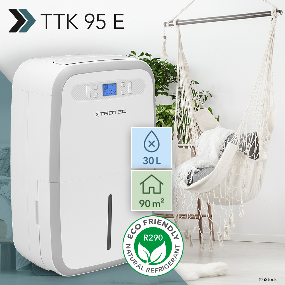 Co?! Kondensuje do 30 l wilgoci z powietrza w pomieszczeniach? W ciągu 24 godzin? I gwarantuje niezawodną suchość pomieszczeń mieszkalnych i biurowych do 90 m²? W takim razie dobrze, że w końcu ponownie dostępny komfortowy osuszacz powietrza TTK 95 E jest już gotowy do użycia. Skoro jest teraz wyposażony we wszystkie standardowe funkcje, takie jak sterowany higrostatem automatyczny układ osuszania z opcją wstępnego wyboru celu, funkcję timera, osuszania prania oraz swing, to wszystko będzie dobrze! I to urządzenie rzeczywiście ma te wszystkie opcje? W takim razie…