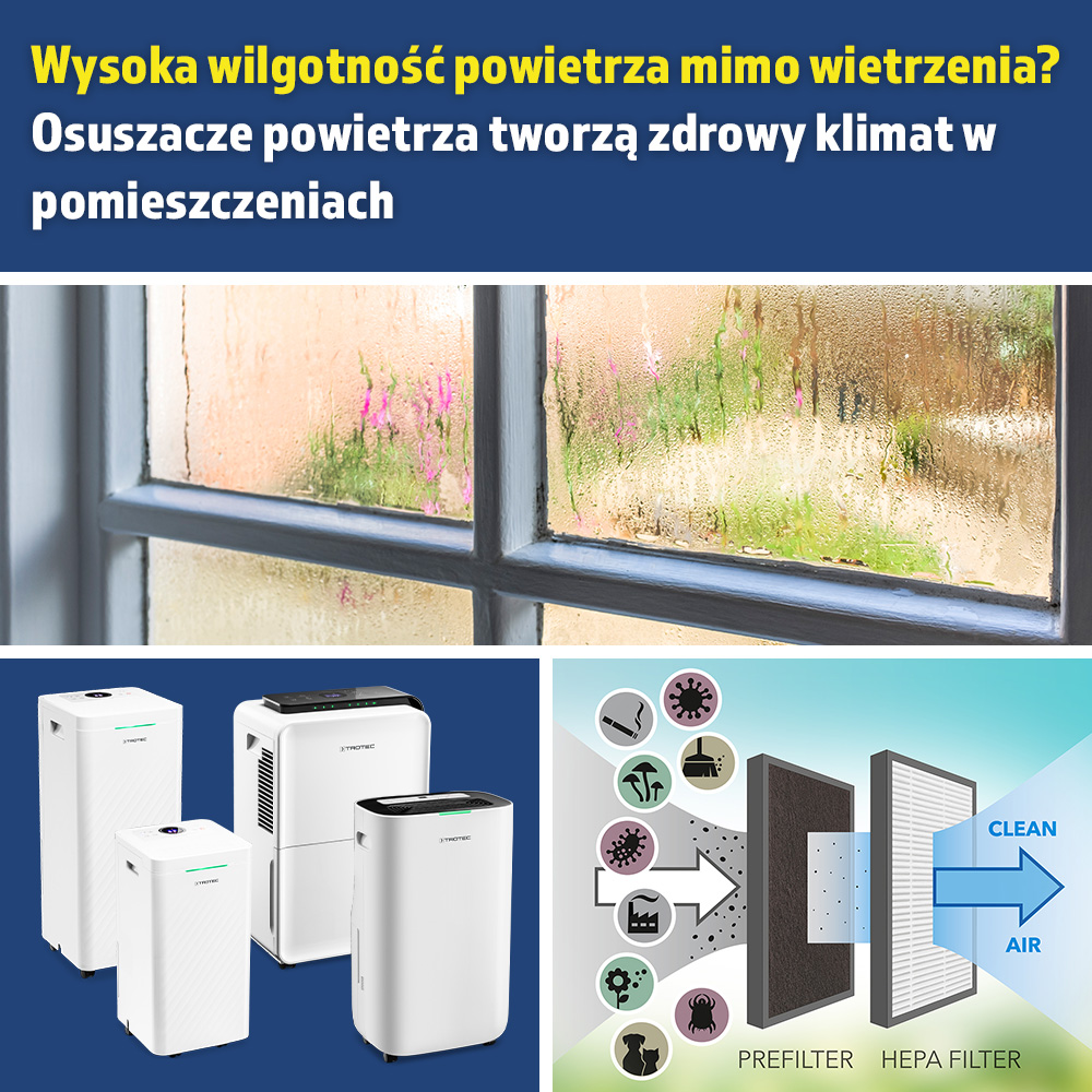 Zarówno w domu, jak i w pracy regularne wietrzenie i odpowiednie ogrzewanie pomagają poprawić jakość powietrza w pomieszczeniach, zapobiegają ryzyku rozwoju pleśni i tworzą ogólnie zdrowszy klimat w pomieszczeniach. Ale co zrobić, jeśli mimo regularnego wietrzenia utrzymuje się zbyt duża wilgotność powietrza? Eksperci polecają mobilne osuszacze powietrza, które w pełni automatycznie zapewniają optymalnie nawilżone powietrze w pomieszczeniach, a nawet je oczyszczają.