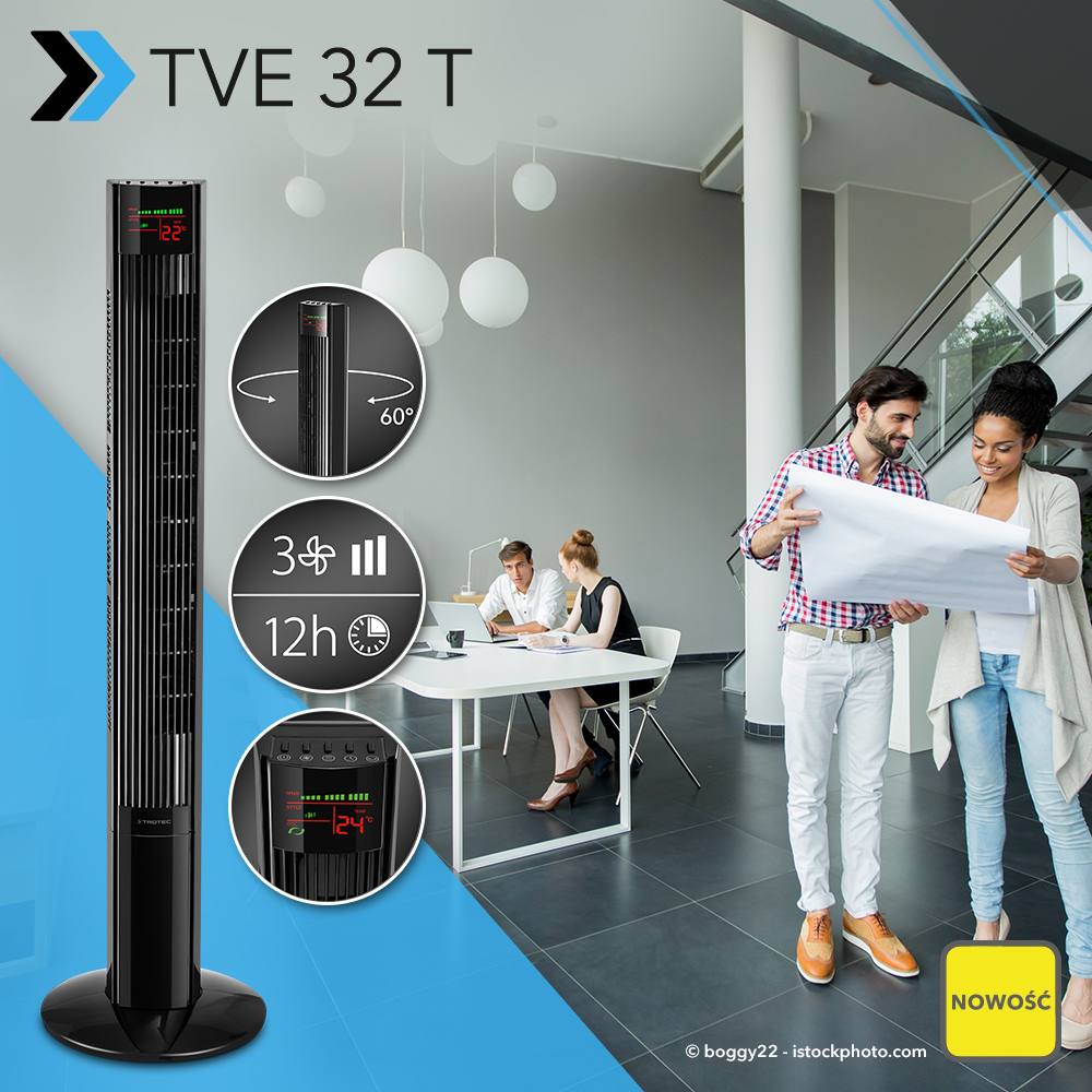 Gdy temperatury wzrastają, zapewnienie przyjemnego chłodu w dużych pomieszczeniach stanowi nie lada wyzwanie. Jednak dla „dużego brata” nieco mniejszego i również już dostępnego modelu TVE 31 T, wentylatora kolumnowego TVE 32 T, to nie problem. Dzięki swojej robiącej wrażenie wysokości 112 cm wiedzie prym, gdy zależy nam na tym, by rozprowadzić chłodne powietrze na możliwie jak największej powierzchni.Poza tym ci dwaj bracia są do siebie tak podobni, jak dwoje jednojajowych bliźniąt – oprócz różnicy w zakresie wysokości…