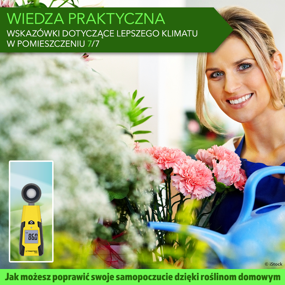 Wyszukane rośliny są sekretną wskazówką każdego ambitnego dekoratora wnętrz, ponieważ sprawiają, że mieszkania i domy wyglądają na bardziej „urządzone” i o wiele bardziej przytulne. Eksperci wiedzą, że zielone rośliny domowe, oprócz efektu dekoracyjnego, również pozytywnie wpływają na klimat pomieszczenia. Ponieważ nie tylko dostarczają tlen i nawilżają, ale są również naturalnymi oczyszczaczami powietrza, które nawet mogą wiązać zanieczyszczenia. W zamian wymagają tylko wody – i wystarczającej ilości światła, co można łatwo sprawdzić za pomocą luksometra BF06 firmy Trotec. W ostatniej części naszej serii Wiedza praktyczna dowiesz się, w jaki sposób możemy wykorzystać wspaniałe właściwości świata roślin, aby uzyskać lepszy klimat w pomieszczeniach.
