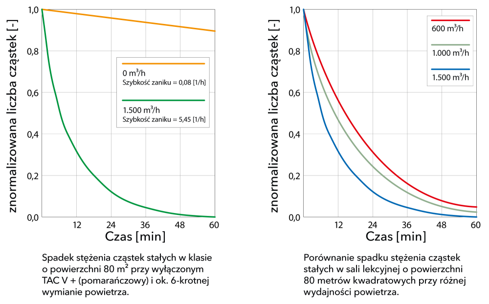 Dowiedziono, że w sali do ćwiczeń o wymiarach do 80 m² wysoce skuteczny oczyszczacz powietrza TAC V+ w ciągu 6 minut zmniejsza ilość wirusów w powietrzu o połowę. W mniejszych pomieszczeniach redukcja stężenia aerozoli o połowę następuje już nawet po 3 minutach.