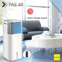Designerski klimatyzer PAE 49 przy swej klasyczno-eleganckiej formie w lśniącej bieli nie tylko przyciąga wzrok, lecz w stopniowo coraz gorętsze dni, całkowicie bez chemicznych środków chłodzących zadba o najbardziej rozkoszne ochłodzenie. Orzeźwienie oparte na zasadzie naturalnego chłodzenia wyparnego sprawdzonej technologii honeycomb: Za sprawą zbiornika wody o pojemności 20 l, dużej wydajności powietrza 750 m³ na godzinę oraz wysokiej wydajności parowania 2 litry na godzinę, do 10 godzin emituje chłodne powietrze bez konieczności uzupełniania zapasów wody.