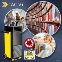 W mobilnym oczyszczaczu powietrza TAC V+ firma Trotec zaprojektowała jedyny w skali światowej oczyszczacz powietrza w pomieszczeniu z technologią oczyszczania powietrza HEPA. TAC V+ tak skutecznie przetacza i oczyszcza powietrze w zamkniętych pomieszczeniach, jak to ma miejsce tylko w otoczeniu sterylnym i salach operacyjnych w szpitalach. Jest to możliwe dzięki bardzo dużej wydajności przepływu powietrza oczyszczacza wysokiej częstotliwości oraz nowoczesnemu wysoce wydajnemu filtrowi HEPA o skuteczności filtrowania 99,995%. Tylko tak można trwale utrzymać określony obszar bez wirusów i zarazków. Nawet w bardzo dużych bibliotekach z wysokimi sufitami poprzez połączone zastosowanie kilku urządzeń da się trwale zmniejszyć niemal do zera ilość aerozoli.
