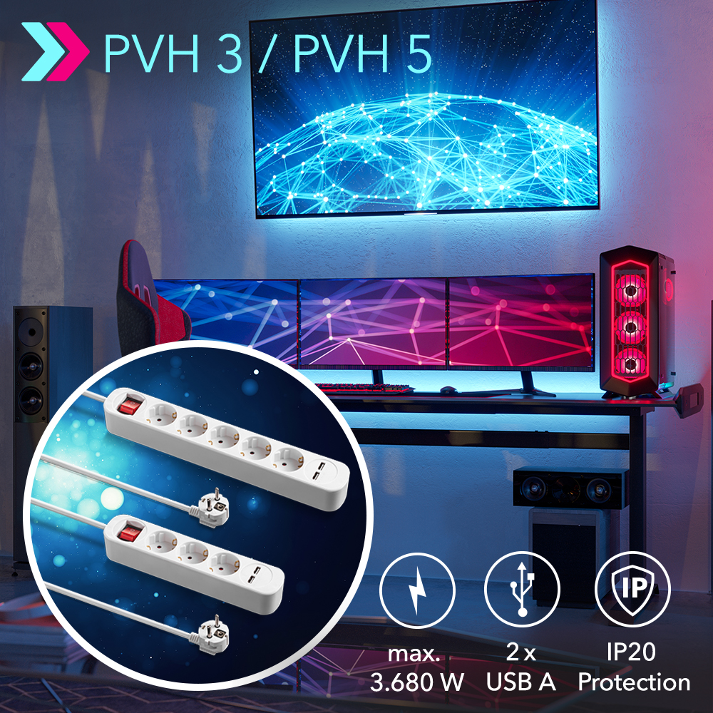 Wystarczy włączyć wyłącznik energooszczędny – i już masz 3 lub 5 dodatkowych aktywnych gniazdek. Wyłącz wyłącznik – i już nawet „ciche odbiorniki” są energooszczędnie odłączone od sieci. Odporne na wysoką temperaturę i uderzenia listwy zasilające PVH3 i PVH5 z kablem o długości 1,5 m zwiększają dostępność istniejących gniazdek, trzykrotnie lub pięciokrotnie zwiększając liczbę możliwych do wykorzystania urządzeń z wtyczkami euro / ze stykiem ochronnym, a także umożliwiają jednoczesne ładowanie dwóch smartfonów, tabletów lub innych urządzeń USB prądem do maksymalnie 2,4 A. Dzięki ustawieniu gniazdek pod kątem 45°, mieszczą się w nich jedna obok drugiej również wtyczki większych zasilaczy.