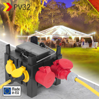 Solidną mobilną rozdzielnicę z tworzywa sztucznego PV32 można za sprawą obu gniazd CEE (32 A i 16 A, 400 V) i trzech gniazd z zestykiem ochronnym (16 A, 250 V) wykorzystywać jako rozdzielnicę prądu trójfazowego i strumienia świetlnego. Wszystkie gniazda są wyposażone w samozamykające się klapki. Wbudowany ochronny wyłącznik różnicowo-prądowy (RCD) oraz wyłączniki instalacyjne gwarantują wyjątkowe właściwości ochronne i są w bezpieczny sposób wbudowane pod składanym okienkiem wziernym w pokrywie obudowy.