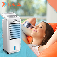 Aircooler PAE 26 chłodzi wyłącznie świeżą wodą z kranu, którą wlewa się do 4-litrowego zbiornika na wodę. Filtr parowania o strukturze plastra miodu nawilża zasysane powietrze i wydmuchuje je ponownie jako strumień chłodnego powietrza. Dodając kostki lodu lub akumulatory chłodzące, wydajność chłodzenia może zostać jeszcze bardzie zauważalnie wzmocniona.