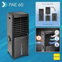 Nowy klimatyzer Aircooler PAE 60 obniża temperaturę powietrza w pomieszczeniu w całkowicie naturalny sposób dzięki innowacyjnej technologii plastra miodu: bez chemikaliów, energochłonnego kompresora chłodzącego i uciążliwych węży odprowadzających. Podczas przepływu przez wilgotny filtr o strukturze plastra miodu powietrze w pomieszczeniu jest schładzane przez pobór energii cieplnej, nawilżane zimną lub lodowatą wodą, oczyszczane w filtrze powietrza z kurzu, kłaczków lub sierści zwierząt i wydmuchiwane do pomieszczenia jako lodowaty, świeży strumień. W ten sposób Aircooler ze zbiornikiem wody o pojemności 40 litrów i szybkością odparowania 2,6 litra na godzinę zapewnia ponad 15 godzin chłodzenia – i dlatego stanowi optymalne rozwiązanie do pomieszczeń o powierzchni do 72 m2 lub kubaturze do 180 m³. A co najlepsze: gdy klimatyzer nie jest potrzebny, można go złożyć z 98 cm do 70,5 cm i wygodnie schować w szafie.