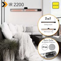 Zimą, wiosną i jesienią albo w chłodne letnie dni dzięki nowoczesnemu promiennikowi ciepła na podczerwień IR 2200 o industrialnym wyglądzie możesz wreszcie uniezależnić przestrzeń mieszkalną, która obejmuje także przestrzeń na zewnątrz, od pór roku i temperatury. Błogie ciepło podczerwone promiennika o długości 1039 mm odczuwa się na skórze od razu po jego włączeniu. Aby umożliwić regulację intensywności ogrzewania, urządzenie IR 2200 jest wyposażone w dwa poziomy ogrzewania o mocy 1100 W i 2200 W – wybierane za pomocą dołączonego pilota lub panelu sterowania znajdującego się z boku urządzenia. Aby światło z promiennika nie zakłócało atmosfery Twojego otoczenia, urządzenie współpracuje z lampami podczerwieni z 80-procentową redukcją światła i najnowszą technologią niskiego olśnienia. Elegancki promiennik ciepła doskonale sprawdza się także w sektorze komercyjnym – zapewniając zauważalny wzrost obrotów w gastronomii zewnętrznej.