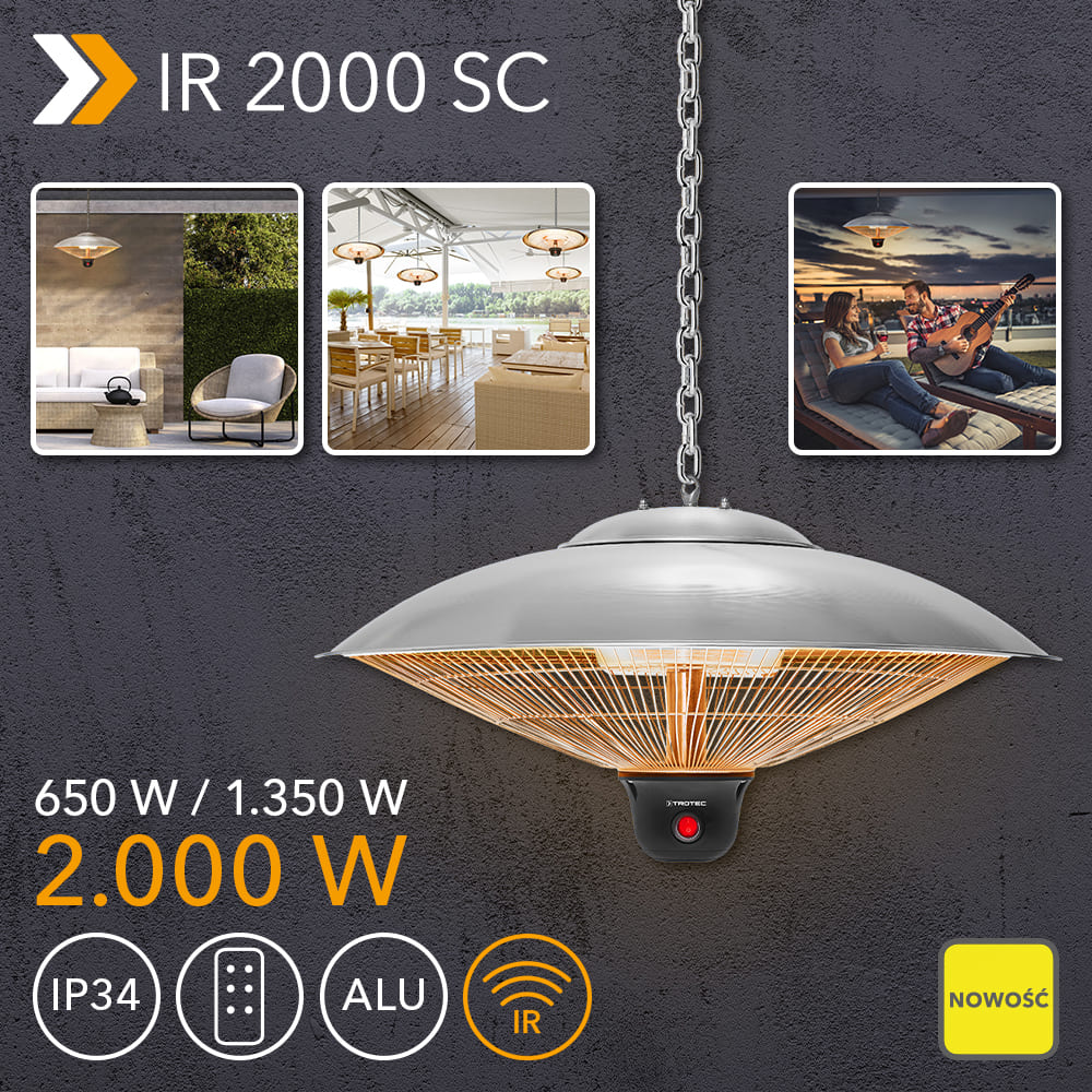 Dzięki mocy 2000 W i trzem stopniom ogrzewania do wyboru: 600 W, 1350 W i 2000 W designerski sufitowy promiennik ciepła IR 2000 SC zapewnia zawsze tyle przyjemnego ciepła, ile wymaga pogoda i indywidualne potrzeby. Wszystko można wygodnie regulować za pomocą pilota, siedząc komfortowo na huśtawce. Dzięki dużemu reflektorowi (60,5 cm!) promiennik emituje we wszystkich kierunkach równomierne ciepło na powierzchnię do 10 m² — co da się natychmiast odczuć na skórze i przedmiotach! Co więcej, nowy promiennik sufitowy w industrialnym stylu z osłoną reflektora wykonaną z matowego aluminium również bardzo atrakcyjnie wygląda. Z tego powodu, a także dzięki swojej bryzgoszczelnej konstrukcji świetnie się sprawdza również w zadaszonych ogródkach gastronomicznych.