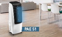 Ledwo dosłyszalny tryb nocny oraz funkcja timera, która automatycznie wyłączy klimatyzer po upływie wybranego czasu, zapewnią regenerujący sen. Wszystkie ustawienia przeprowadza się na urządzeniu za pomocą oświetlonego diodami LED panelu obsługowego lub dostarczanego wraz z urządzeniem pilota na podczerwień. Lekka konstrukcja i kółka sprawiają, że PAE 51 to mobilny klimatyzer do użytku zarówno wewnątrz, jak i na zewnątrz, nawet na balkonie lub tarasie.