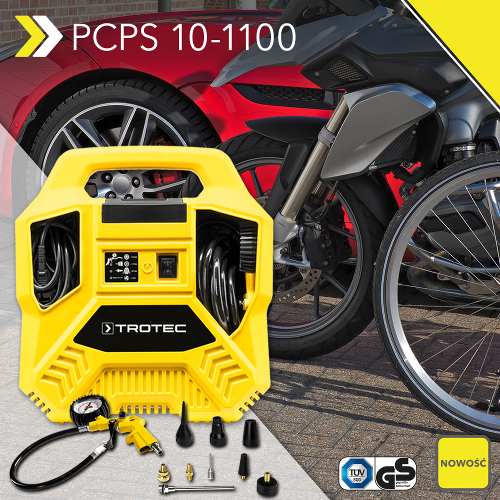 Wysokowydajny i nareszcie ponowienie dostępny kompresor PCPS 10‑1100 firmy Trotec jest idealny do następujących zastosowań: Napompowania opon samochodowych, motocyklowych, rowerowych oraz piłek, łóżek powietrznych, dmuchanych materaców i basenów. „Zawsze i wszędzie dostępny serwis pompowania opon” został pomyślany jako integralne rozwiązanie walizkowe, w skład którego wchodzi wszystko, czego potrzebujesz do napompowania powietrza, na przykład przewód i pistolet pneumatyczny z manometrem oraz różne zawory.
