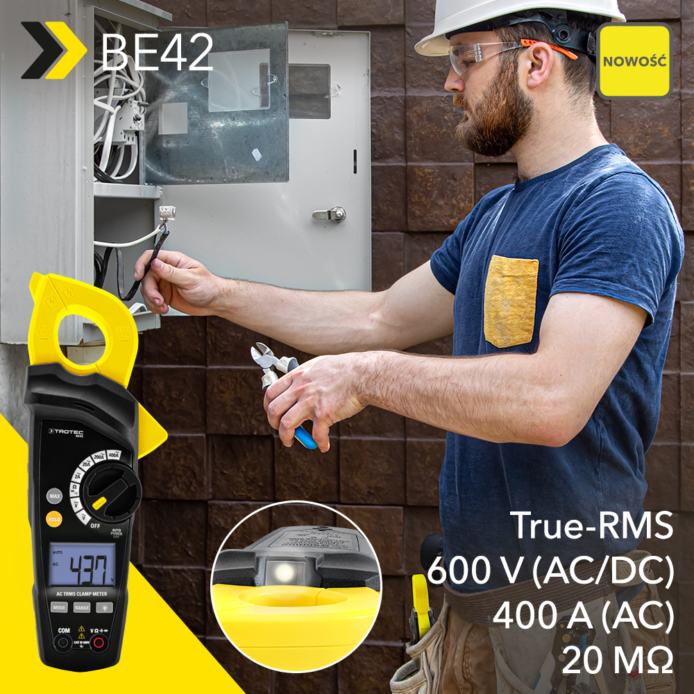 Dobra wiadomość dla elektryków i techników serwisowych: nowy amperomierz cęgowy BE42 jest już dostępny. Dzięki profesjonalnemu i kompleksowemu wyposażeniu ten superprecyzyjny przyrząd pomiarowy spełnia praktycznie wszystkie życzenia użytkowników: nadaje się do pomiaru napięcia stałego i zmiennego, prądu zmiennego, rezystancji oraz kontroli ciągłości obwodów, bezpieczników i styków. W związku z tym oraz dzięki kompleksowemu wyposażeniu w ułatwiające pracę funkcje nowy miernik cęgowy True RMS firmy Trotec wielokrotnie przewyższa tradycyjne multimetry.