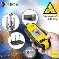 Miernikiem promieniowania BR16 można łatwo wytropić sprawców zbyt wysokich wartości promieniowania, jak i źródła zakłóceń, które są przyczyną problemów w gospodarstwie domowym lub w miejscu pracy. Zakres pomiarowy wynosi przy tym od 0 do 9,99 mW/cm² (częstotliwość: 2,45 GHz). Jeżeli wykryta wartość pomiaru przekracza maksymalną dopuszczalną wartość ICNIRP – 5 mW/cm², miernik promieniowania BR16 automatycznie ostrzega użytkownika za pomocą dźwięku oraz migającej na czerwono pod wyświetlaczem diody LED. A co najlepsze: Cała obsługa urządzenia odbywa się w sposób przyjazny dla użytkownika poprzez jedynie trzy przyciski.
