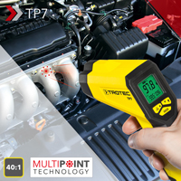 Nowy profesjonalny termometr na podczerwień firmy Trotec umożliwia precyzyjne pomiary w jak najkrótszym czasie: Zamiast wizualizacji celu pomiaru za pomocą lasera pojedynczego lub tylko wielkości plamki pomiarowej za pomocą lasera podwójnego, wielopunktowy laser TP7 łączy obie te technologie, aby zmierzenie obiektu było łatwiejsze i dokładniejsze: Centralny laser celowniczy pokazuje punkt pomiarowy. Osiem dodatkowych laserów wizualizuje punkty krańcowe powierzchni pomiarowej.