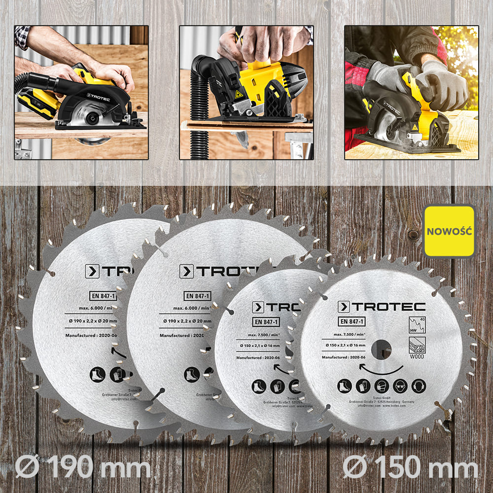 Okres lockdownu to doskonały czas dla domowych majsterkowiczów i rzemieślników. Listopad to bowiem idealna pora na realizację projektów, na przykład prac z użyciem pił tarczowych, które dotychczas przesuwaliśmy. Dobrze się składa: od teraz w końcu dostępne są bowiem nasze nowe zestawy brzeszczotów pił tarczowych do drewna! Cztery wysokiej jakości zawierające 3 części zestawy ze stali węglowej o markowej jakości Trotec: do wszystkich dostępnych w sprzedaży ręcznych pił tarczowych. Bardzo twarda stal, która wyróżnia się znacznie wyższą ostrością i wytrzymałością: szlifowane, ostre jak brzytwa zęby to z kolei gwarancja szybkich postępów podczas prac.