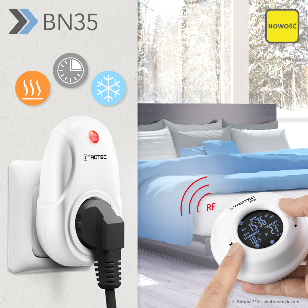 Wygodne rozwiązanie umożliwiające sterowanie termostatem i sterowanie czasowe elektrycznymi urządzeniami grzewczymi lub chłodniczymi jest w końcu dostępne. W końcu dostępny model BN35 pozwala Ci oszczędzić czas i nerwy, ponieważ w przyszłości możesz za pomocą pilota zdalnego sterowania określić, w jakiej temperaturze pomieszczenia elektryczne urządzenia grzewcze lub klimatyzacyjne będą włączane albo wyłączane. A co najlepsze: za pomocą zaledwie jednego termostatu radiowego, a zatem nadajnika, możesz sterować do 100 radiowymi gniazdami, odbiornikami jednocześnie. Nie musisz przy tym nawet wstawać. Możesz to zrobić z kanapy…aaach … ….