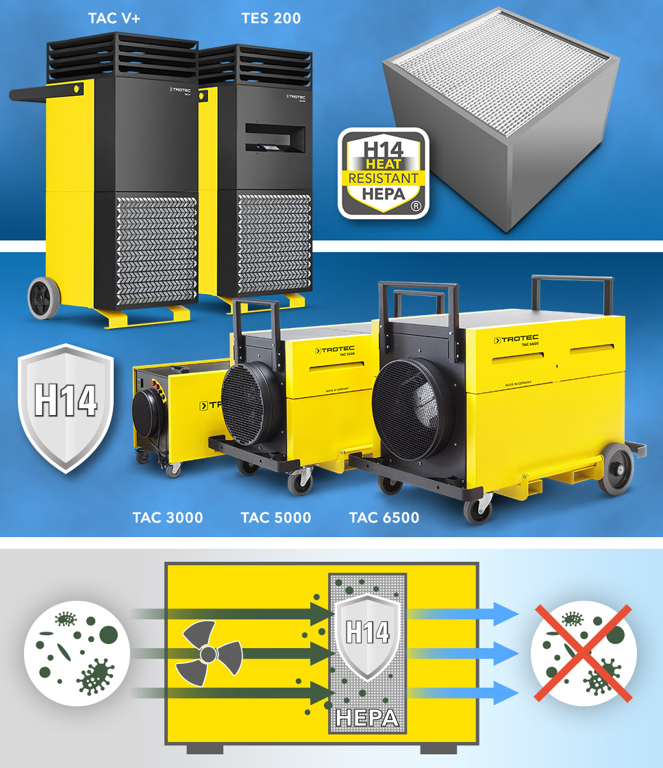 Wszystkie oferowane przez firmę Trotec wysoce wydajne filtry H14 spełniają najwyższe wymagania jakościowe w zakresie filtrowania bakterii i wirusów: