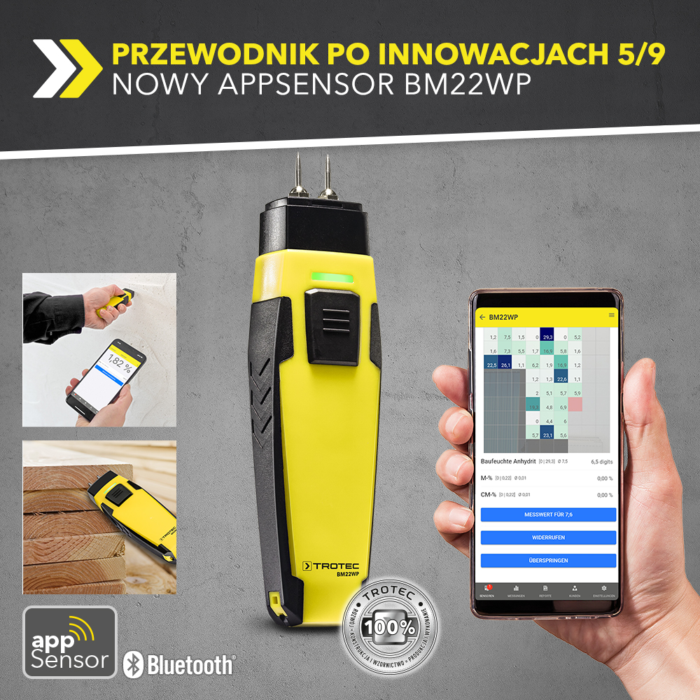 A wszystko to dzięki wyjątkowemu połączeniu: Z jednej strony połączenieappSensor BM22WP i zintegrowanej, bezpłatnej aplikacji Multimeasure Mobile umożliwia niezawodny pomiar wilgotności drewna i budowli przy wykorzystaniu metody oporowej. Z drugiej stronyużytkownik może skorzystać z dodatkowych funkcji, takich jak analiza, kontrola danych i dokumentacja, bezpośrednio z poziomu własnego smartfona.Obsługa urządzenia pomiarowego i analiza danych odbywa się w niezwykle energooszczędny sposób, a dodatkowo pozwala zaoszczędzić miejsce.