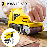 • jest w swej obsłudze zaskakująco nieskomplikowana. I tak PBSS 10‑600 posiada automatyczne centrowanie taśmy, które samo automatycznie ustawia taśmę szlifierską przy włączeniu urządzenia. Oprócz tego można precyzyjnie wyjustować bieg taśmy do zastosowania urządzenia w miejscach przylegających, bez krawędzi. Taśmę szlifierską, dzięki zintegrowanemu systemowi dźwigni napinającej, można w kilka sekund skutecznie wymienić bez używania dodatkowych narzędzi. Prędkość taśmy można dostosować bezstopniowo również podczas jej pracy za pomocą łatwo dostępnego, wbudowanego w uchwyt pokrętła.