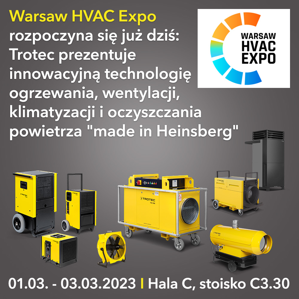Od dziś do 03 marca trwają w Warszawie „największe targi techniki grzewczej, wentylacyjnej i klimatyzacyjnej” Warsaw HVAC Expo. Jako wiodący producent innowacyjnych rozwiązań HVAC, firma Trotec również zaprezentuje swoje innowacje produktowe 2023. Spotkaj się z naszymi konsultantami-ekspertami w hali C na stoisku C3.30 i wspólnie poszukajmy odpowiedzi i rozwiązań na obecne i przyszłe wyzwania.