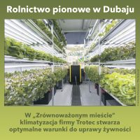 Tak zwana uprawa wertykalna w halach staje się coraz bardziej popularna jako sposób na uprawę zdrowej i świeżej żywności w pustych fabrykach, magazynach lub przerobionych kontenerach transportowych, zamiast importować ją z odległych krajów. Tego typu kryte farmy powstają na całym świecie, a jedna z nich znajduje się w „The Sustainable City”, stosunkowo nowej dzielnicy Dubaju. Dubaj jest znany z pełnych przepychu centrów handlowych, parków rozrywki i gigantycznych drapaczy chmur. Mniej znany jest fakt, że Dubaj jest także pionierem w zakresie zrównoważonego rozwoju.