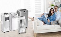 - Urządzenia te pracują zgodnie z zasadą parowania dyfuzyjnego, znanej również jako tak zwane „chłodzenie adiabatyczne”. Wyparowywana jest przy tym woda lub lód a chłodny strumień powietrza rozprowadzany jest w pomieszczeniu za pomocą wentylatora.