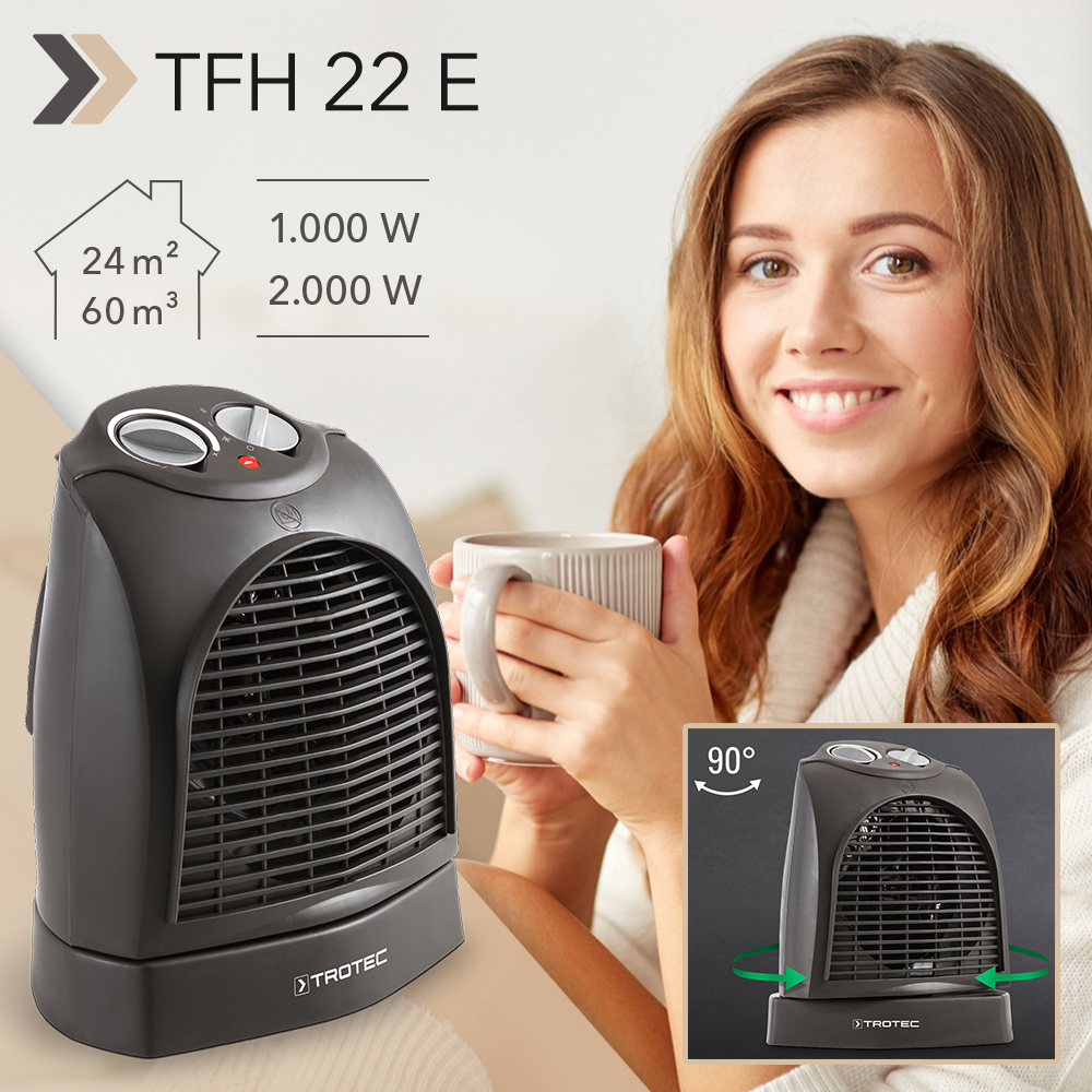 O eficiente termoventilador moderno TFC 21 E, finalmente disponível, com elemento de aquecimento PTC de cerâmica, proporciona calor adicional nos iminentes dias frios de inverno. Um calor agradável, não apenas devido ao excecional design do produto, mas também porque aquece o espaço de forma a consumir o mínimo de energia possível. Com o seu controlo por termostato integrado, o aquecedor rápido supre, de forma sensível e energeticamente eficiente, as suas divisões com um fluxo de ar quente constante, na gama de temperaturas de 15 °C a 35 °C. É precisamente regulado ao grau, graças à cómoda predefinição do valor-alvo.