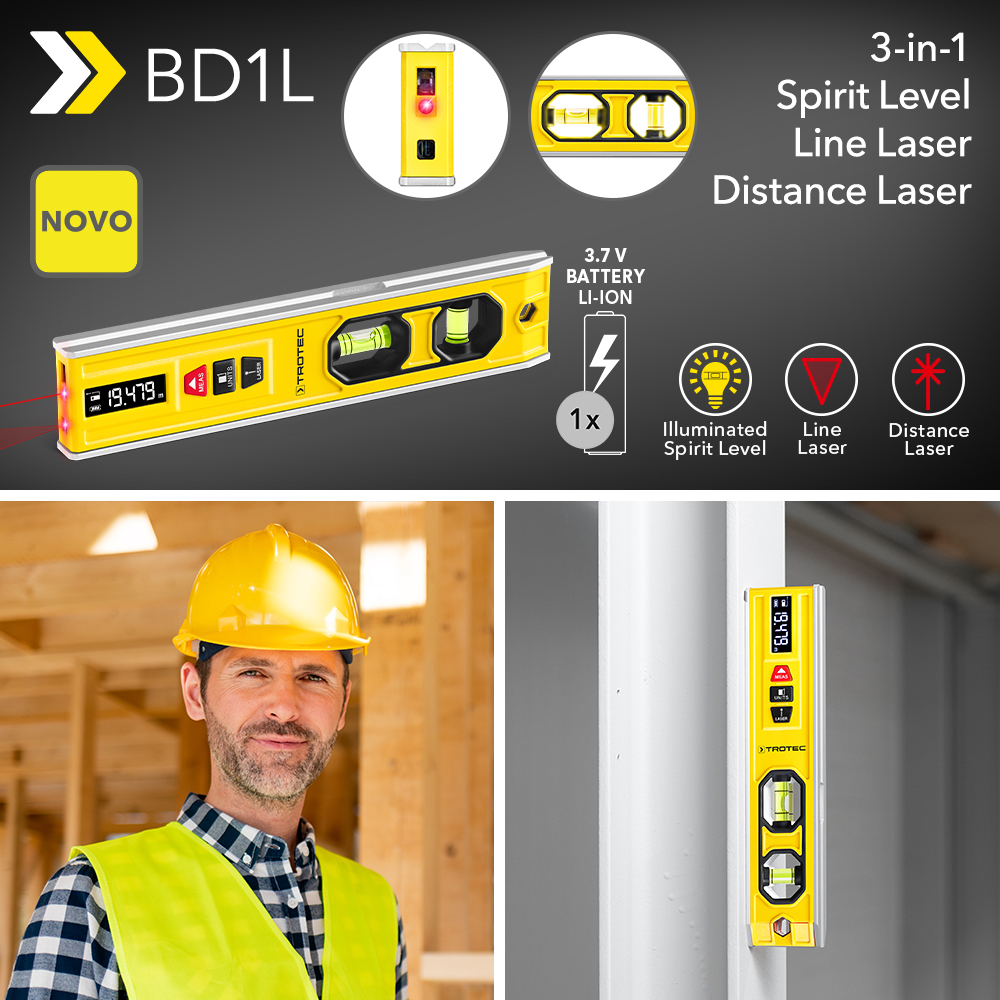 Praticamente sem limites. Fácil de operar. Formato superprático. Perfeito para artesãos, instaladores, decoradores ou adeptos da bricolagem: o novo nível de bolha de ar laser a bateria BD1L da Trotec combina 3 aparelhos de medição num só. Um nível de bolha de ar com bolha horizontal/vertical iluminada para medição de nível. Um laser de linha comutável para a projeção de uma linha de laser 100% horizontal com alcance de 10 metros. E um aparelho de medição de distâncias a laser para a determinação de distâncias entre 0,20 e 20 metros, com precisão milimétrica. Com ele pode marcar furos em distâncias exatamente iguais, muito facilmente, alinhar molduras com exatidão e medir distâncias com precisão milimétrica.