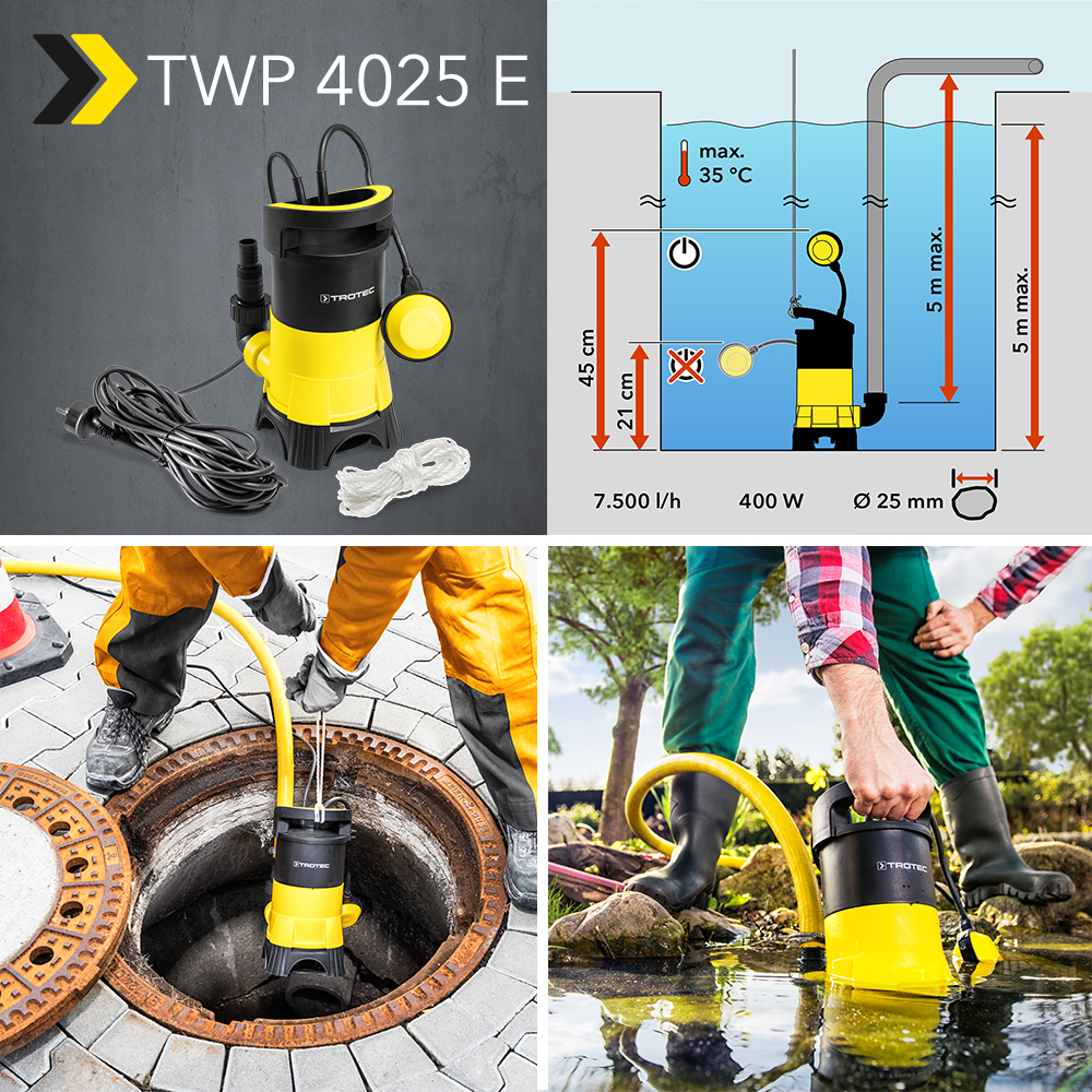 A cave de casa está inundada? O poço de drenagem tem de ser esvaziado? Ou o lago de jardim muito sujo? Extrair água suja em casa, no jardim e de fontes da forma mais rápida e eficiente possível – isso é uma brincadeira para a robusta e potente bomba submersível para águas residuais TWP 4025 E, pois foi para isso que ela foi concebida à partida. Ela supera qualquer desafio e, com uma potência absorvida de 400 W, movimenta por hora até 7500 litros de água suja – com partículas de sujidade de até 25 milímetros – até uma altura manométrica de 5 metros. E deixa novamente secas caves e divisões inundadas, num instante.