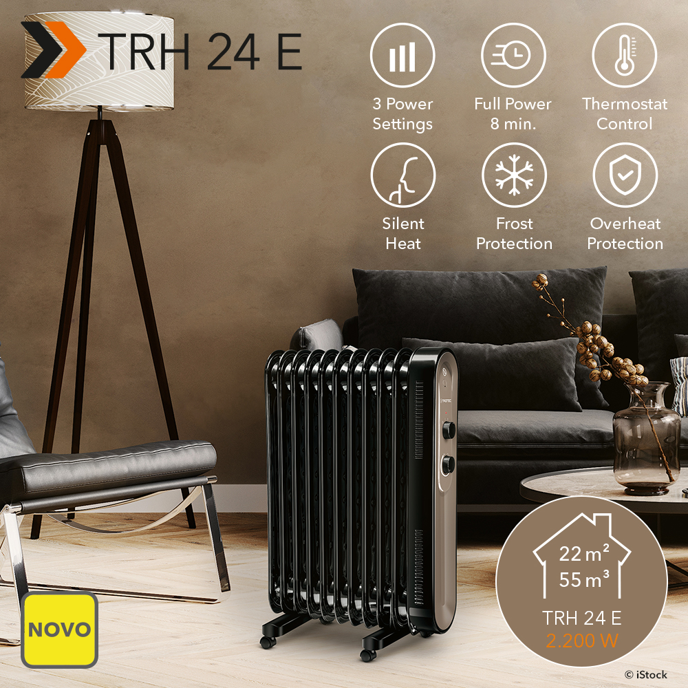 NOVO Aquecedor a óleo TRH 24 E: melhor aquecimento com uma potência de 2.200W, três níveis de aquecimento e 30 minutos de aquecimento depois de desligado – finalmente disponível