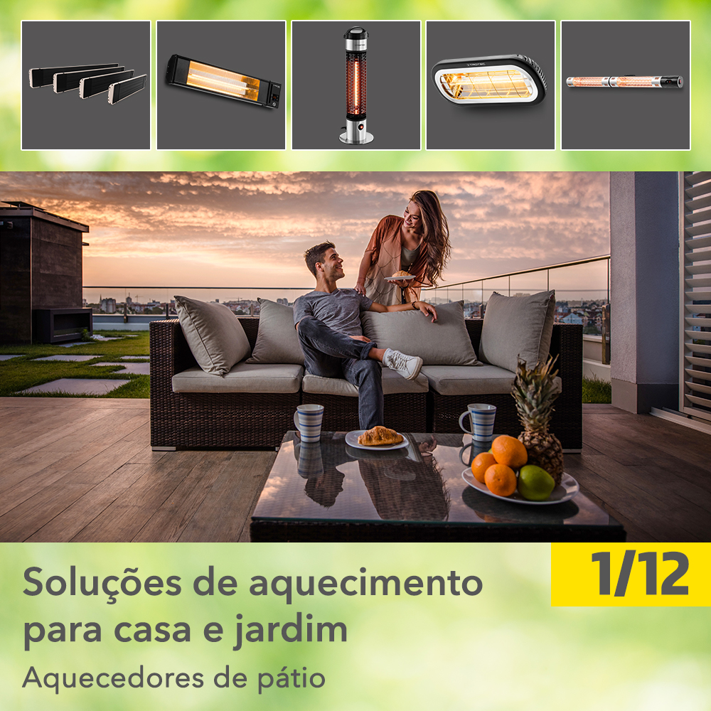 Começo da primavera. O momento certo para se certificar de que em casa e no jardim tudo está em ordem – e para fazer uma ou outra reparação, melhoramento ou embelezamento. Dispomos de quase tudo o que necessita em termos de práticas ferramentas elétricas. O nosso atual programa dá-lhe a conhecer as ferramentas elétricas de alto desempenho da Trotec, com e sem fio, todas elas profissionais, a um preço próprio de ferramentas DIY. O nosso programa de primavera é completado por bombas de alto desempenho para a irrigação do seu jardim e por dispositivos de medição exatos para controlo da sua piscina e de grelhados Mas, para começar, queremos inspirá-lo com soluções de aquecimento que poderá utilizar para desfrutar do seu terraço ou varanda mesmo em dias frios.