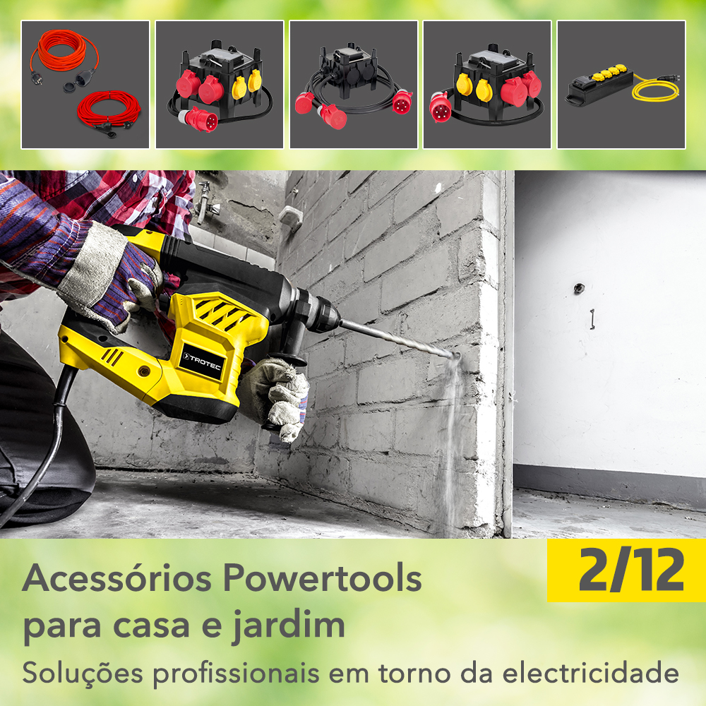 Vamos referir-nos hoje aos frequentemente subestimados acessórios para ferramentas elétricas: o cabo de extensão supostamente simples e os quadros de energia profissionais portáteis ou o bloco de tomadas. Na maior parte dos casos, a sua ausência só é notada muito tarde, frequentemente até só pouco antes de se iniciarem os trabalhos previstos. Demasiado tarde! Portanto, antes de usar os seus aparelhos elétricos, verifique se o conjunto de acessórios necessário está realmente completo. Aliás, nem os cabos de extensão nem os quadros elétricos portáteis da Trotec são realmente simples: Com esses robustos acessórios para profissionais, você vai ampliar o alcance operacional das suas ferramentas elétricas. E todos possuem a classe de proteção IP44 (régua de tomadas: classe de proteção IP54) à prova de pingos de água e, portanto, apto para uso em estaleiros de obras e jardins.