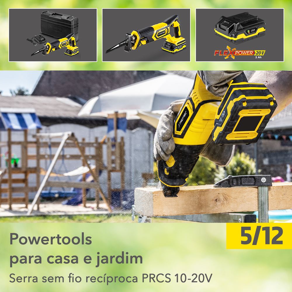 Não importa se é metal ou madeira, plástico ou qualquer material de construção, se são cortes retilíneos ou curvos – e também, se o trabalho vai ser iniciado agora na primavera ou mais tarde: Com a potente serra sabre sem fio PRCS 10-20V você chegará praticamente onde quiser. Entre outras coisas, devido à sapata guia com ajuste inclinável de 30°, o ajuste do curso à especificidade do material e o curso pendular opcional. E isso, porque a potente bateria de iões de lítio com 20V/2Ah de longa duração garante um alto rendimento de corte contínuo e uniforme. Assim, muitos trabalhos de corte em casa ou no jardim podem ser realizados de forma particularmente cómoda com uma serra sabre sem fio.