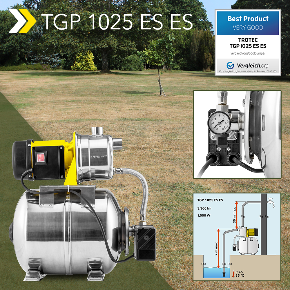 Todos sabemos que apenas uma percentagem muito reduzida das tarefas domésticas exige água potável. Para a máquina de lavar e o autoclismo, para limpezas e para regar o jardim, geralmente é suficiente recorrer à água da chuva ou bombear água de uma fonte ou de um riacho que passa pelo seu jardim. Quem prevê um potencial de poupança elevado nesta solução tem toda a razão – e todas as vantagens, se apostar no sistema doméstico de abastecimento de água TGP 1025 ES ES, novamente disponível, para bombear esta água de serviço alternativa. Este aparelho convence graças à sua potente taxa de fluxo volumétrico, estando protegido contra corrosão pela sua construção praticamente total em aço inoxidável.