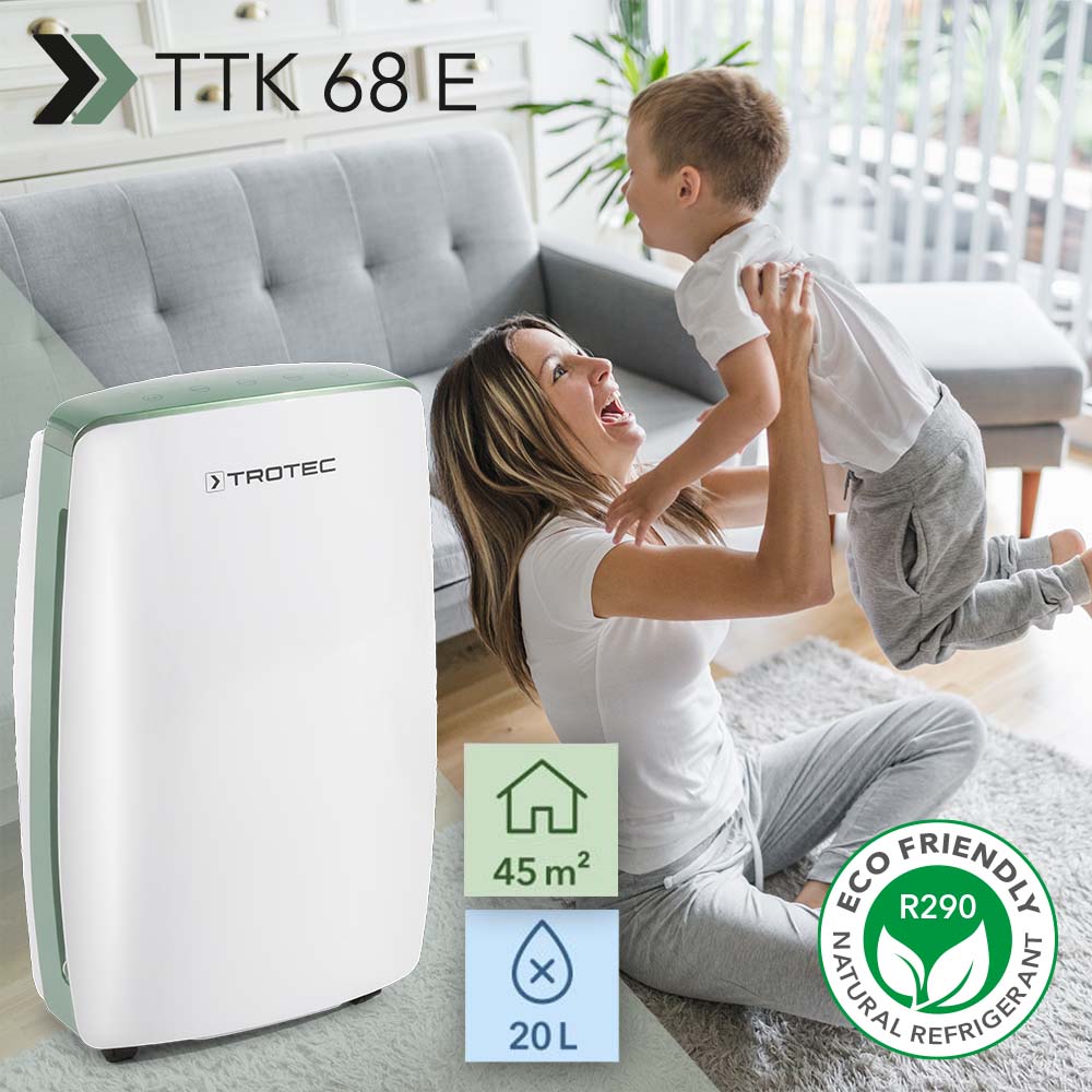 Uma ótima climatização ambiente constitui a base para que nós, seres humanos, possamos ter uma agradável sensação de conforto: Pesquisas sobre este tema revelaram que a mais agradável sensação de conforto é perceptível no âmbito de uma faixa climática com temperaturas compreendidas entre 20 e 22°C e uma humidade relativa entre 40 e 60%. Por isso, parece-nos oportuno apresentar-lhe hoje um renomado especialista na área de “ambientes saudáveis e de bem-estar”: trata-se aqui do novamente disponível Desumidificador Confort TTK 68 E, que inclui, naturalmente, uma luxuriosa e completa gama de funcionalidades, tais como o controlo automático por higróstato, a pré-seleção do valor real de humidade, 3 opções de funcionamento, além de vários outros extras.