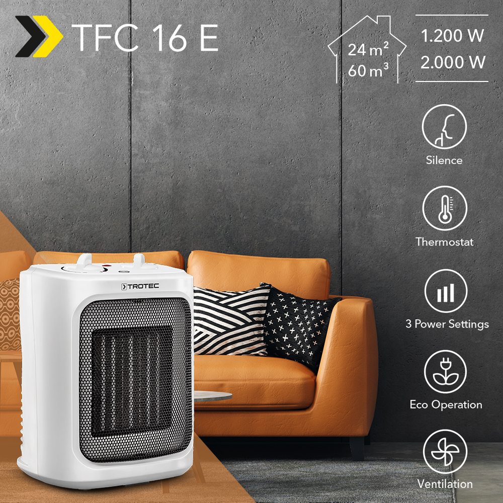 Perante o frio que ameaça invadir as habitações e os escritórios devido a uma eventual falha de combustível para os aquecimentos a gás, os termoventiladores elétricos são a nova norma de ouro. Então, apresentamos um aquecedor que merece, sem dúvida, este título, pois combina praticamente todas as vantagens que distinguem tais aparelhos: o termoventilador cerâmico TFC 20 E gera calor rapidamente, graças aos seus elementos de aquecimento PTC de cerâmica, aquece de forma potente com os seus dois níveis de aquecimento comutáveis de 1000 e 2000 W, ocupa pouco espaço, graças à sua compacta estrutura em forma de torre, e poupa custos energéticos, uma vez que o termostato de ambiente integrado assume a regulação da temperatura. E o melhor: está disponível e pronto a enviar!