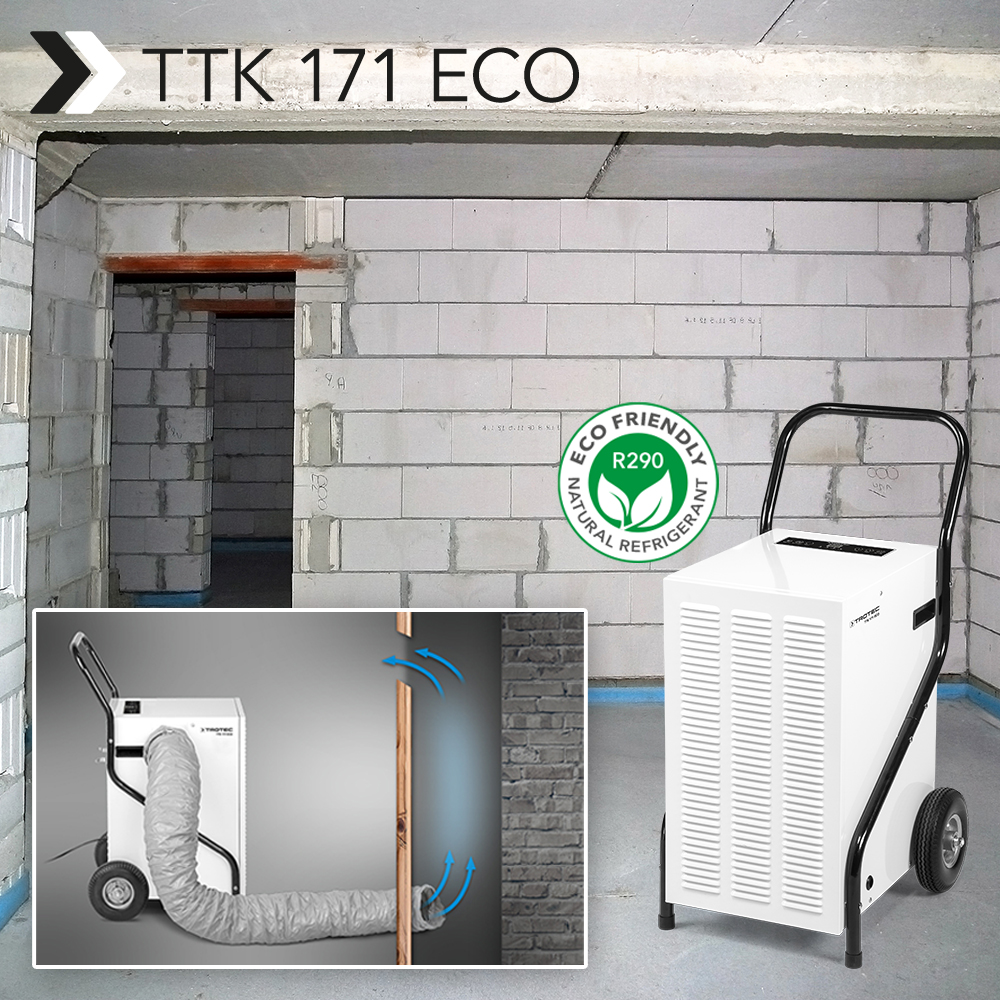 Bom Ano Novo com a nossa melhor oferta para empresas de construção e reparadores de danos causados por água: o desumidificador comercial TTK 171 ECO, finalmente disponível de novo! A um preço loucamente baixo, naturalmente válido também para qualquer outro caçador de pechinchas profissional. Afinal de contas, graças ao seu funcionamento automático controlado por higróstato, este secador comercial é adequado para múltiplas aplicações – seja para desumidificar estaleiros, salas, quartos, casas de banho e caves, lavandarias, casas de fim de semana, autocaravanas, embarcações, bem como para manter permanentemente secos armazéns, arquivos, laboratórios, garagens, sanitários, balneários e vestiários.