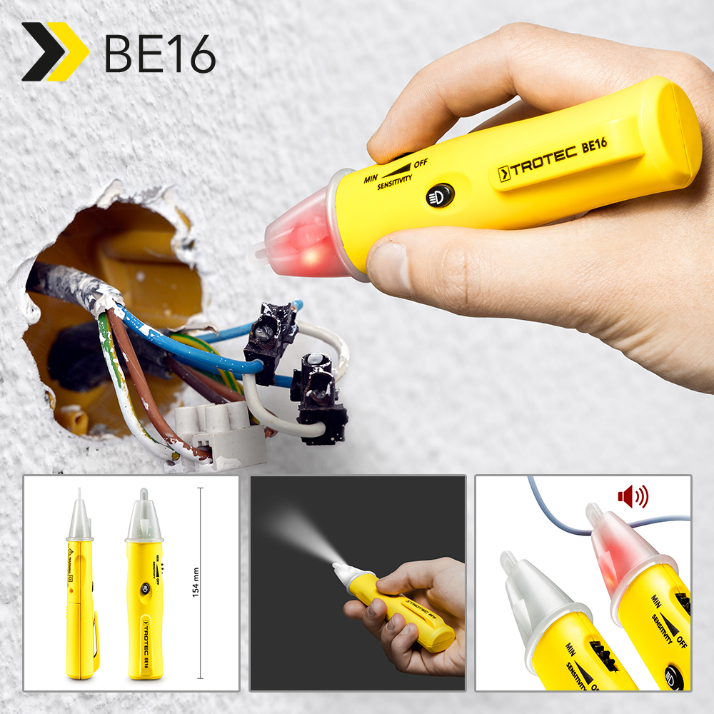 Ninguém gosta de se sentir “sob tensão”. Por isso mesmo, o detetor de tensão sem contacto BE16 deve fazer parte do equipamento básico de qualquer artesão ou adepto da bricolagem. Pois este medidor rápido e prático deteta, de forma fiável, fontes de tensão de apenas 5 volts até 1000 volts ou 50 Hz até 400 Hz. O melhor: através do método de medição capacitiva, basta uma aproximação sem contacto ao condutor – e o detetor avisa-o imediatamente através de um LED vermelho intermitente em toda a ponta do detetor. Além disso, é emitido um sinal sonoro de aviso.