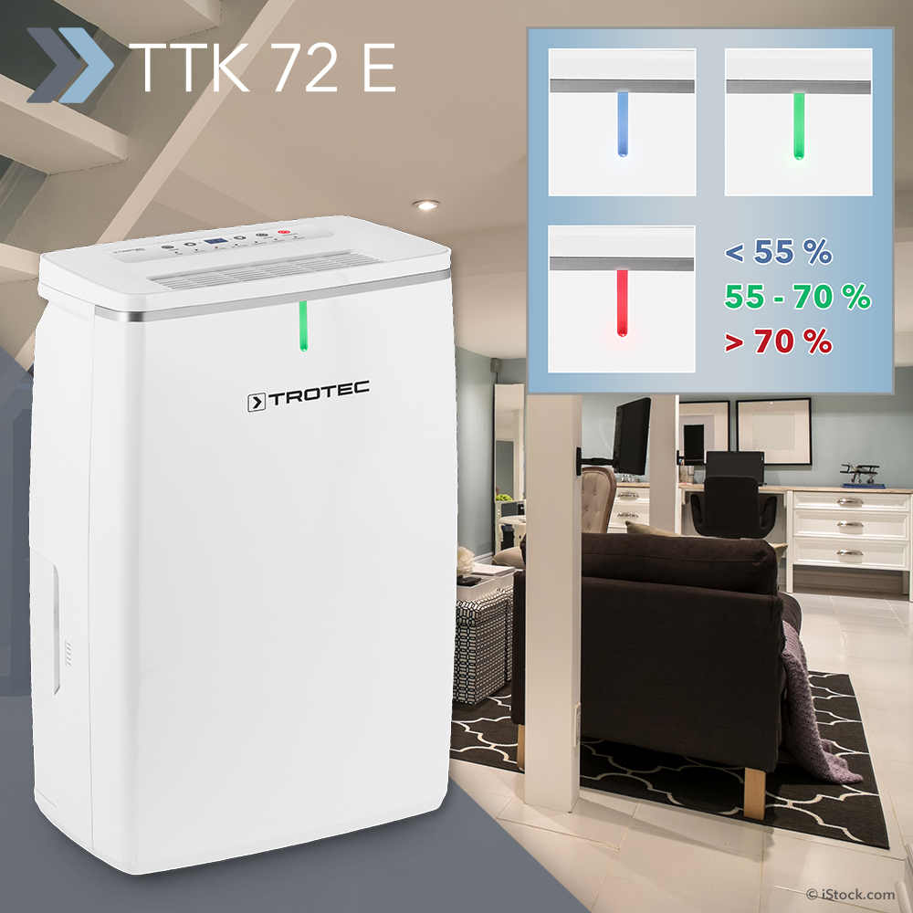 Esta poderia ser a imagem do progresso na sua habitação: Ao chegar a casa, pendura o seu casaco molhado num cabide, descalça as suas botas de inverno, igualmente molhadas, e abre o chuveiro para a água ficar quente – através de um único olhar pode constatar que o atual nível de humidade não ultrapassa o limite crítico. Apesar da humidade transportada do exterior, e não obstante o uso de água quente no chuveiro do quarto de banho. Isto, porque o desumidificador Confort TTK 72 E, agora novamente disponível, indica através de uma luz LED integrada, se a climatização nos espaços de habitação ou no escritório se encontra dentro dos limites saudáveis. E é assim mesmo que deve ser!