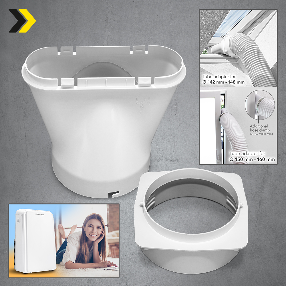 Já é proprietário de um aparelho de ar condicionado portátil? Então parabéns! Ou está a pensar comprar um ainda a tempo para enfrentar a primeira vaga de calor? Fantástico! Na nossa diversificada gama de produtos irá encontrar, por certo, o aparelho que procura exatamente. No entanto, como utilizador de ar condicionado portátil deveria em ambos os casos adquirir também um prático suplemento – o nosso adaptador para o tubo do ar de exaustão, também designado adaptador ou bocal de janela. Pois este adaptador simplifica significativamente o encaminhamento do tubo do ar de exaustão para o exterior: Seja através de uma janela basculante aberta ou da vedação de janela Trotec AirLock 100 / 1000.