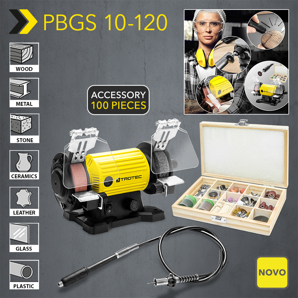 NOVA Lixadora dupla PBGS 10-120: lixadora dupla de 120 watts eficiente com veio flexível e conjunto de acessórios com 100 peças – finalmente disponível
