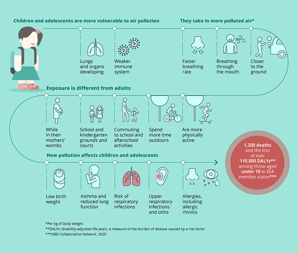 Diversos fatores tornam as crianças e os jovens especialmente vulneráveis à poluição atmosférica. As crianças têm uma frequência respiratória mais elevada que os adultos e, ao respirar, inalam mais ar por quilograma de peso corporal. Devido à sua altura mais baixa, inalam o ar mais próximo do chão, onde se concentram e difundem poluentes, como partículas finas. Segundo a AEA, para além da indústria e do trânsito, os aquecimentos são os principais responsáveis pela poluição atmosférica na Europa.