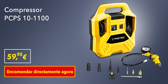 Cada vez mais cadeias de postos de combustível estão a instalar equipamentos de ar comprimido que apenas medem a pressão dos pneus sob pagamento. Por um euro, é possível, num período de tempo limitado, verificar a pressão do ar e reabastecer os pneus. Esta quantia aparentemente reduzida paga pelo self-service vai acumulando ao longo dos anos. A longo prazo, fica mais económico verificar a pressão dos pneus com um compressor próprio na garagem de casa. Sem ter de ir para a fila e enfrentar uma longa espera. O compressor de ar PCPS 10-1100 está atualmente disponível por apenas 59,95 € (em vez de 103,31 €) na loja online da Trotec.