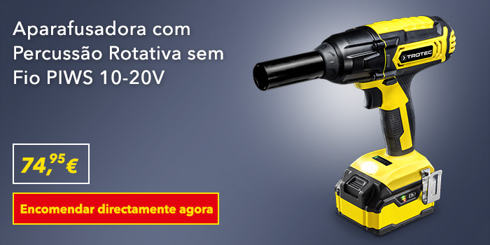 A troca de pneus de inverno pelos de verão custa cerca de 80 euros numa oficina especializada (incluindo o armazenamento dos pneus). A aparafusadora de impacto rotativa sem fio PIWS 10-20V está disponível na loja online da Trotec por apenas 74,95 €. Os custos de aquisição são amortizados numa única troca de pneus.